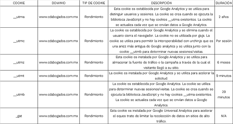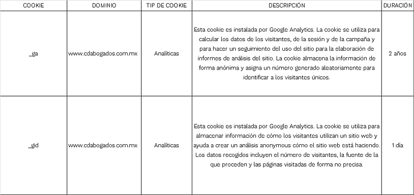Esta Política de Cookies complementa la información contenida en nuestro Aviso de Privacidad con la finalidad de brindar mayor información respecto a cómo CDA Abogados («CDA») como responsable del tratamiento de datos personales así como nuestros socios comerciales y proveedores de servicios como encargados utilizan cookies y tecnologías relacionadas en el curso de la gestión y prestación de nuestros servicios en línea y nuestras comunicaciones con nuestros clientes y usuarios. Se explica qué son las cookies, el tipo de cookies que se utilizan, cómo y para qué las utilizamos, durante cuánto tiempo, así como los derechos de los usuarios para controlar el uso que hacemos de ellas.